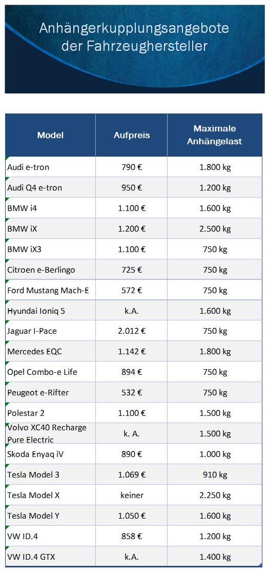 Die Herausforderung für Elektroautos, Last zu ziehen, wird immer wieder als Thema genannt. Tatsächlich gibt es noch wenige Fahrzeuge, die mehr als zwei Tonnen ziehen können. Hier findet sich beispielhaft eine kurze Übersicht ohne Gewähr. Bitte ggf. genau verifizieren und Angebote vergleichen: